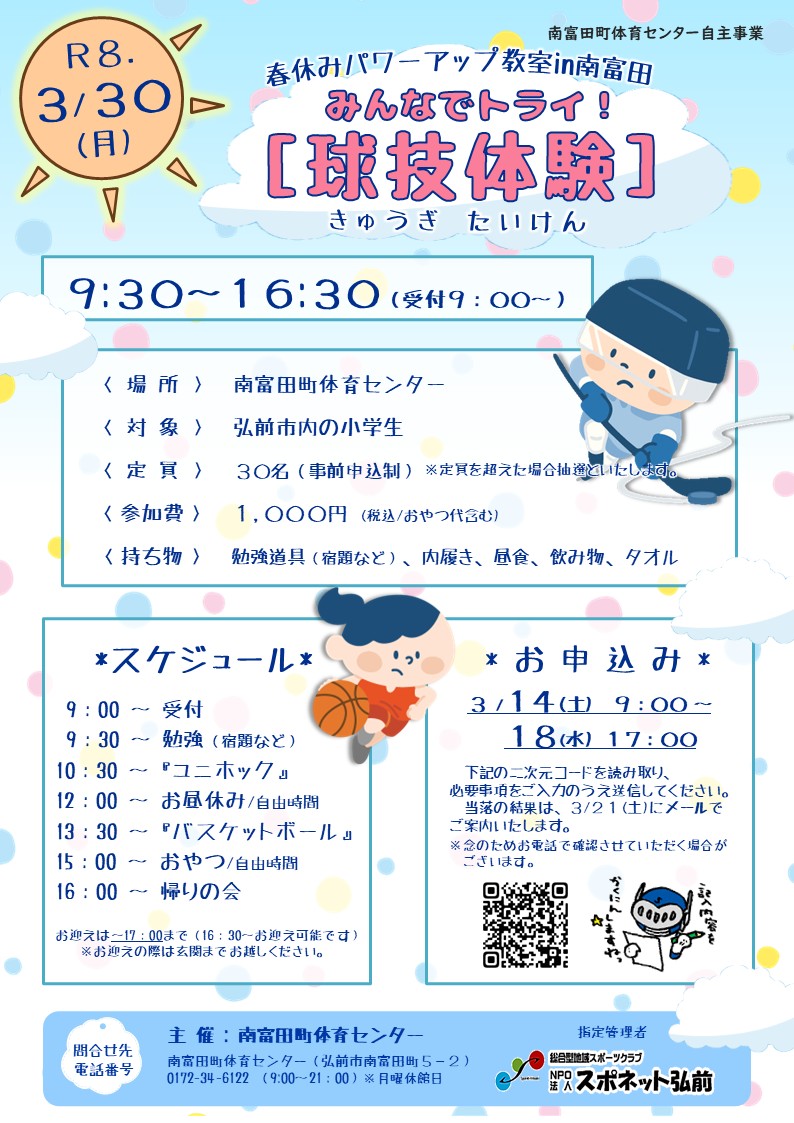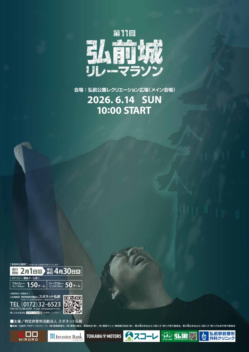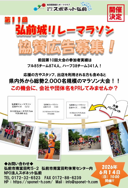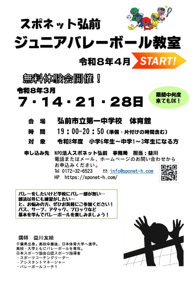サイトトップ 2012.06.28 弘前城リレーマラソン チビッコバスケットボール教室 ソフトボール教室 バレーボールサークル ランニングクラブ キッズバレーボール教室 弘前パラスポクラブ はじめての釣り教室 はじめての登山教室 ダムダム!バスケットボール 親子レクリエーション派遣 バドミントン'Smile' 走り方教室 キッズスポーツひろば with チアダンス教室 弘前城リレーマラソン 教室・サークル 出張コーチ受付中! 会員登録はコチラから 定期活動スケジュール 会員専用ページ お知らせ 2026年2月24日【新設】ジュニアバレーボール教室【4月START!!】 2026年2月24日令和8年度への更新、月謝、年会費の価格変更について 2026年2月24日令和8年3月 教室・サークルのスケジュールを掲載しました! 2026年2月14日【3/2~受付開始】市民農園利用者を募集!【小栗山農村交流公園】 2026年2月3日【開催中止】2/3登山教室講習会 2026年2月2日【エントリー受付開始!】第11回弘前城リレーマラソン 2026年1月24日1月25日(日)スポーツ雪合戦は中止になりました 2026年1月24日令和8年2月教室・サークルのスケジュールを掲載しました! 2026年1月7日【3/7(土)】『ボッチャ大会』開催 2026年1月7日【2/14(土)】『親子で!ソフトバレー』開催 お知らせ一覧へ NPO法人 スポネット弘前