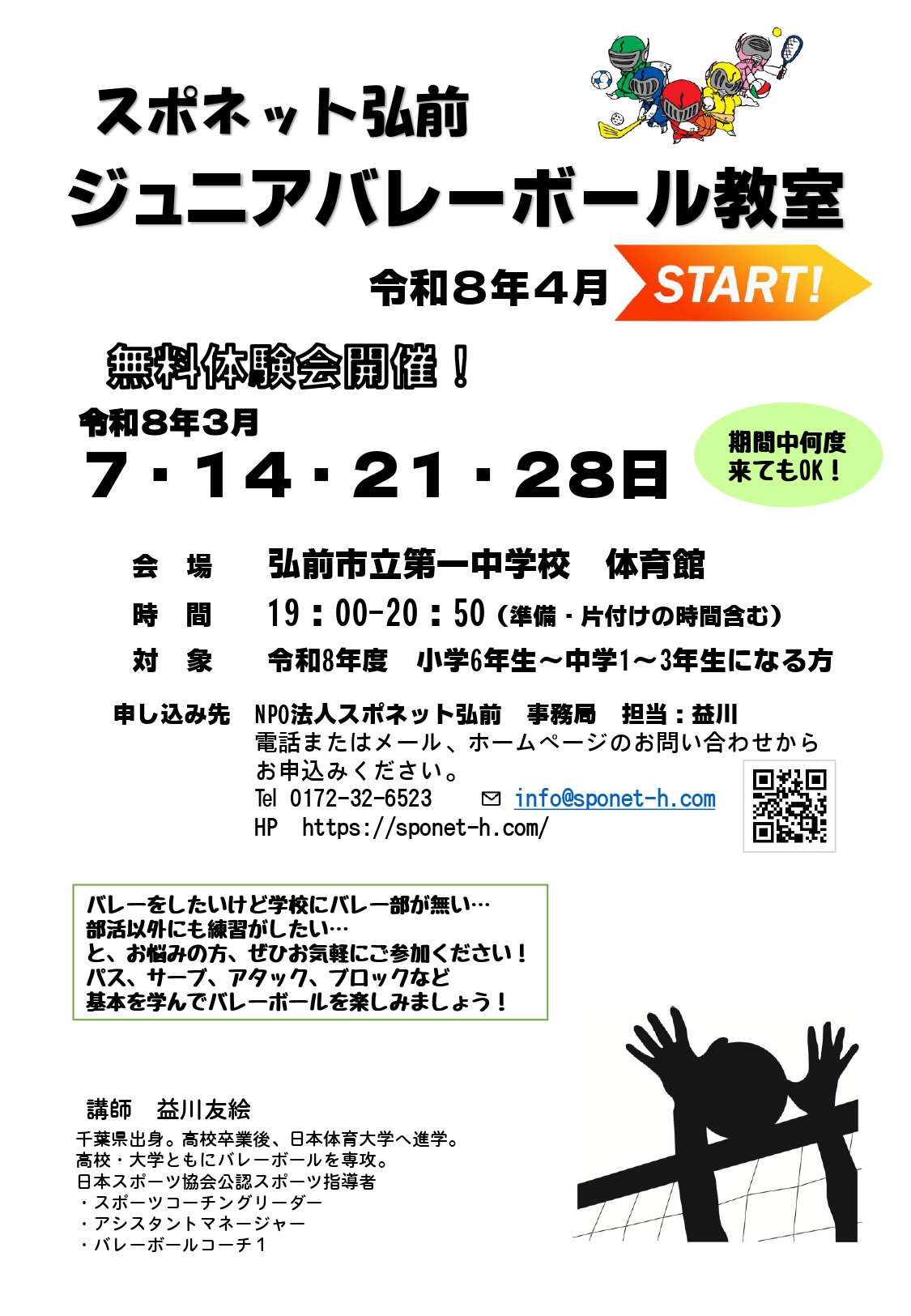 参加申込みはスポネット弘前へ電話またはメール、ホームページ上にある「お問い合わせ」からお申込みください。
